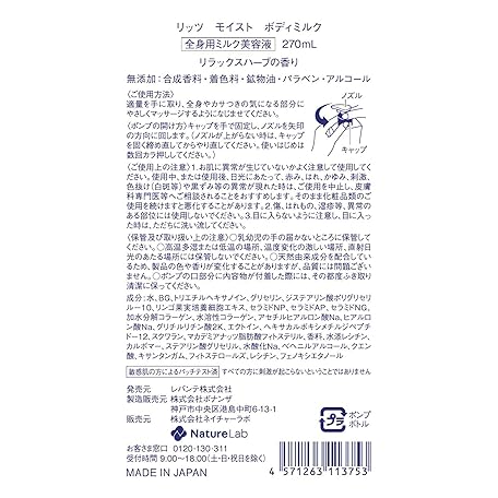 Sản phẩm リッツ モイスト ボディミルク 270ml [リラックスハーブの香り] 全身用ミルク美容液 濃密保湿 đang được bán với giá ưu đãi là $16.8841 tại nước Nhật.