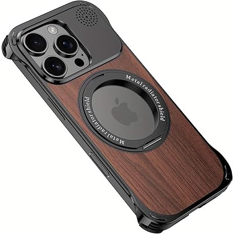 [360° Rotating Stand / MagSafe Compatible] iPhone 15 Pro Max/15 Pro / 15 Case, Heat Dissipation, Aluminum Alloy Case, Walnut Wood Back, Aluminum Alloy Frame, Ultra-thin Frameless Design, 360 Degree