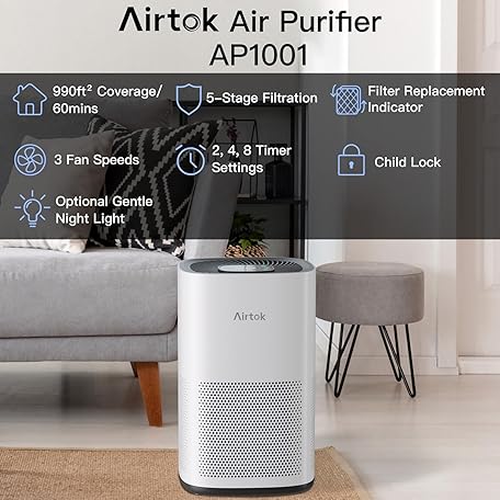 Thông tin sản phẩm AIRTOK Air Purifier, Suitable for Large Room in Home Bedroom with H13 True HEPA Filter, Removes 9.9% to 0.1ml | Ozone Free, Night Light