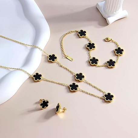 AmorArtSky ラッキークローバーネックレスジュエリーセット、18Kゴールドメッキフラワーデザイン5つ葉のブレスレット、クローバーネックレスペンダント、女性へのクローバーイヤリング、お母様、妻、娘、友人への幸運の贈り物。