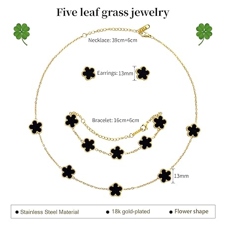 Thông tin sản phẩm AmorArtSky ラッキークローバーネックレスジュエリーセット、18Kゴールドメッキフラワーデザイン5つ葉のブレスレット、クローバーネックレスペンダント、女性へのクローバーイヤリング、お母様、妻、娘、友人への幸運の贈り物。