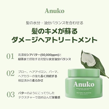 Thương hiệu Anuko là cái tên nổi tiếng được rất nhiều khách hàng trên thế giới chọn lựa. Với kiểu dáng đẹp mắt, sang trọng, sản phẩm Anukoナーリッシング ヘアバター(ダメージ用ヘアマスク)200ml/韓国コスメ/シアバター&グリーンティー/ヴィーガントリートメント  là sự lựa chọn hoàn hảo nếu bạn đang tìm mua một món  cho riêng mình.