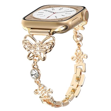 スタイリッシュな女性用メタルバンド Apple Watchバンド 38mm 40mm 41mm 42mm 44mm 45mm 46mmに対応 スリムファンシージュエリーメタルチェーンブレスレットストラップ iWatchバンド Series 11 10 9 8 7 6 5 4 3 SE用 (ゴールド、44mm/45mm/46mm/49mm/42mm(Series 3 2 1))