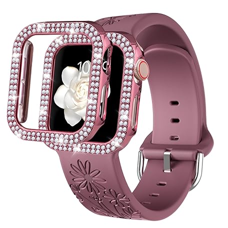 • Apple Watch用刻印バンドとケース 40mm 41mm 42mm 44mm 45mm 46mm 38mm 女性用、ダイヤモンドブリング保護カバー付きシリコンスポーツストラップ iWatch Series 10 9 8 7 6 5 4 3 2 1 SE用