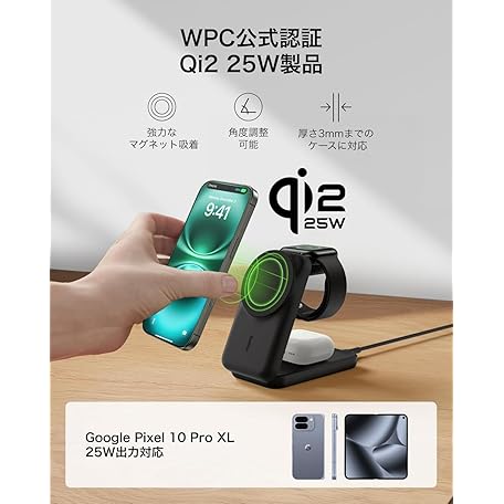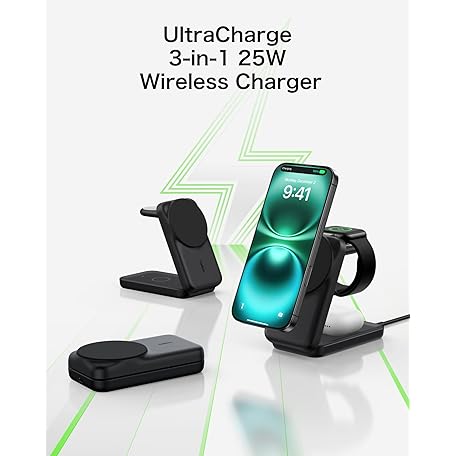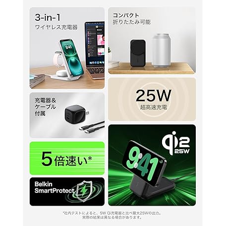 Belkin WIZ036dqBK Qi2 25W Ultra Charge Wireless Charger, 3-in-1 Square Model, Official Qi2 Certified, MagSafe Compatible, Fast Charging, Compatible with iPhone 16/15/14/13/12, Standby Mode, Foldable