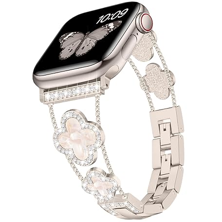 • Bling Diamond Ladies Band Compatible with Apple Watch Band 49mm 45mm 44mm 42mm 41mm 40mm 38mm Ultra SE Series 9 8 7 6 5 4 3 2 1 Cute Lucky Clover Dressy Replacement Bracelet (Starlight Color)