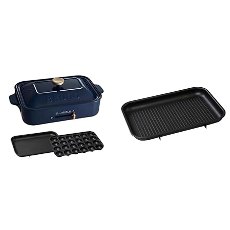• 【セット買い】BRUNO コンパクトホットプレート 本体 プレート2種(たこ焼き 平面) ネイビー 紺 おしゃれ かわいい これ1台 蓋 ふた付き 1200w 温度調節 洗いやすい 1人 2人 + コンパクトホットプレート用 グリルプレート BOE021-GRILL