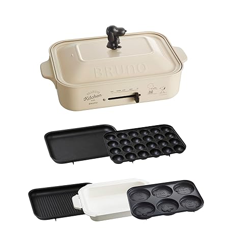 Bruno BOE070-ECRU Compact Hot Plate, Snoopy Peanuts Collaboration, Main Body, Plate, 5 Types (Takoyaki, Flat/Multi, Pot, Grill), Snoopy Knob, White, Stylish, Cute, 1 Lid, Temperature Adjustment, Easy