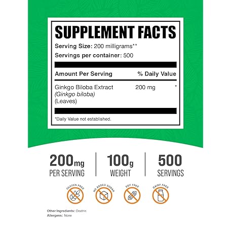 • BulkSupplements.com Ginkgo Biloba Extract Powder - Ginkgo Biloba Supplements, Ginkgo Biloba Powder, from Ginkgo Biloba Leaf - Gluten Free, 200mg per Serving, 100g (3.5 oz) (Pack of 1)
