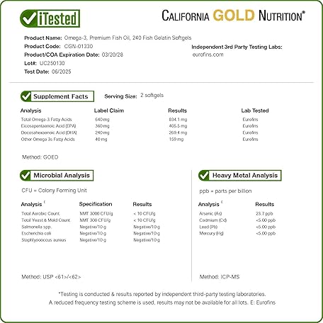 Thông tin sản phẩm California Gold Nutrition, Omega 3, Premium Fish Oil, 240 Fish Gelatin Softgels