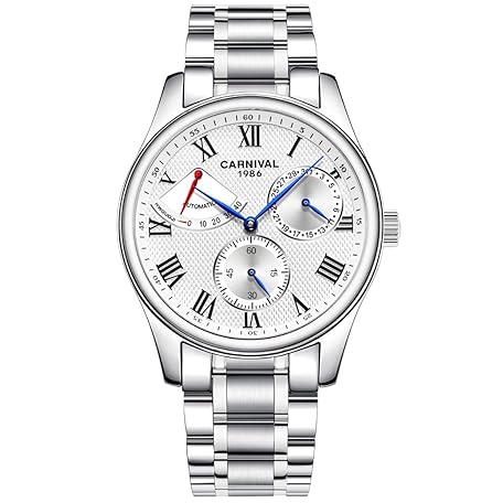 Carnival Men's Automatic Watch Gold Stainless Steel Case Band Waterproof Power Reserve White Dial Wrist Watch Silver/White, silver/white, Dress