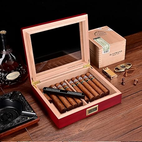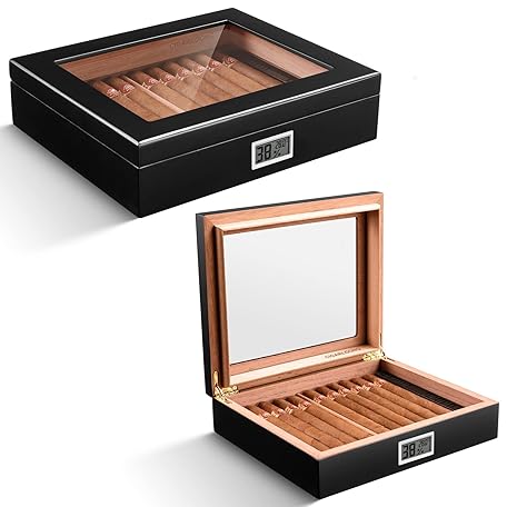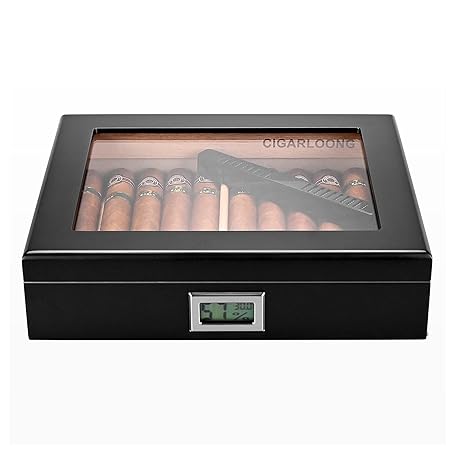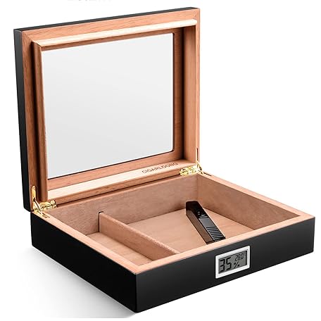 Sản phẩm CIGARLOONG シガー ヒュミドール デジタル湿度計と加湿器付き シダーウッド ガラストップ 取り外し可能な仕切り付き収納シガーボックス 15-25本の葉巻用 (ブラック) đang được bán với giá ưu đãi là $61.7703 tại nước Nhật.