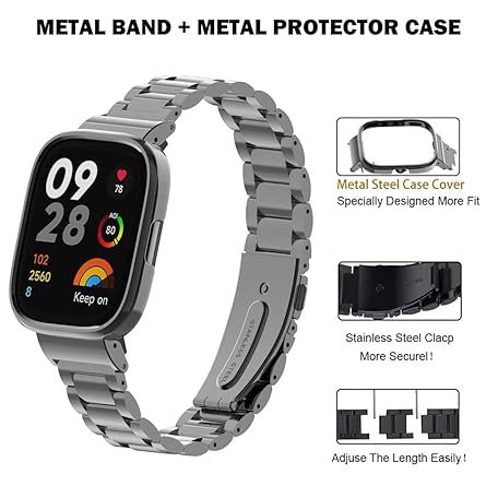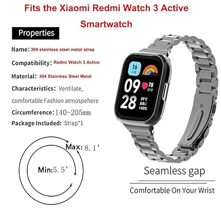 Compatible Xiaomi Redmi Watch 3 Active Replacement Band, Metal, Stainless Steel, Skin Friendly, Rust Resistant, Xiaomi Smartwatch, Redmi Watch 3 Active Replacement Band, Adjustable, Business