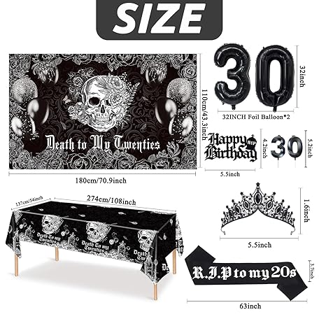 • Crenics Death to My 20s Birthday Decoration(クリニック) Death to My 20代 背景幕 30歳の誕生日 サッシュと王冠 テーブルクロス ケーキトッパー ブラック 30歳の誕生日パーティー用品