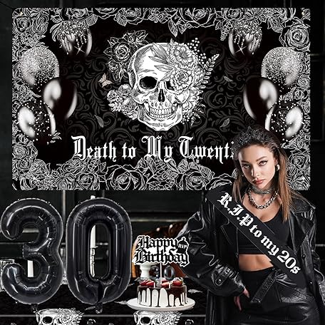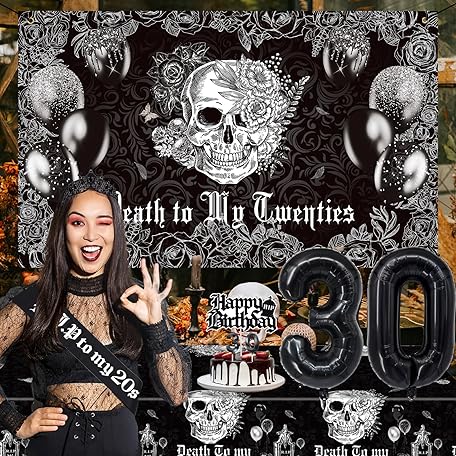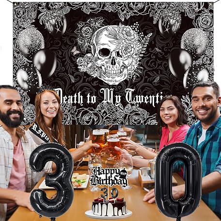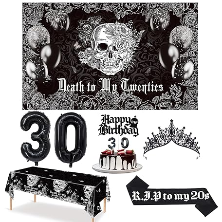 Crenics Death to My 20s Birthday Decoration(クリニック) Death to My 20代 背景幕 30歳の誕生日 サッシュと王冠 テーブルクロス ケーキトッパー ブラック 30歳の誕生日パーティー用品
