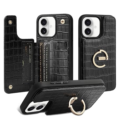 • CUSTYPE iPhone 17 ウォレットケース カードホルダー、180°リングホルダー キックスタンド カードスロットケース、iPhone 17 6.3インチ用PUレザー保護ケース - ブラック