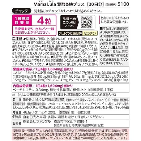 Thông tin sản phẩm FANCL Mama Lula Folic Acid & Iron Plus, 90 Day Supply (30 Day Supply x 3 Bags), Supplement (Iron/Folic Acid Supplement/Vitamin B6), Pregnancy, Lactation