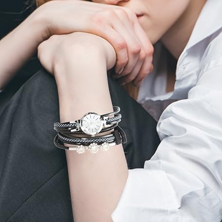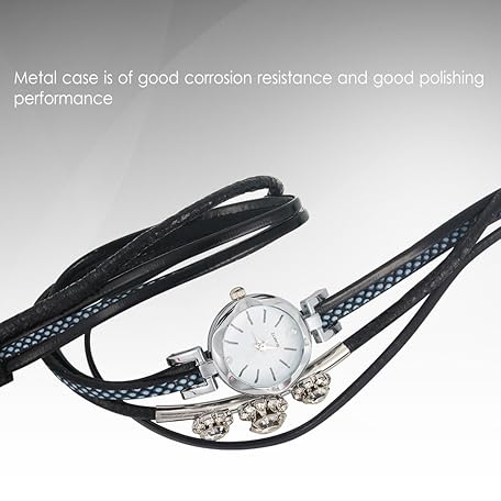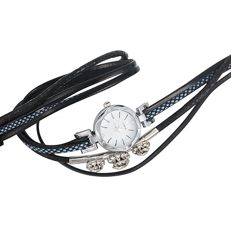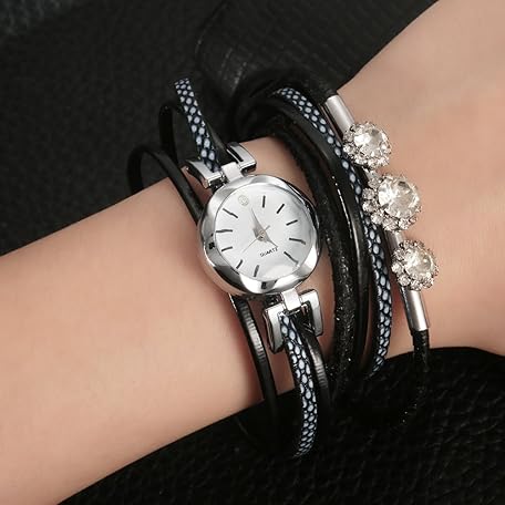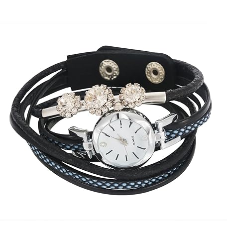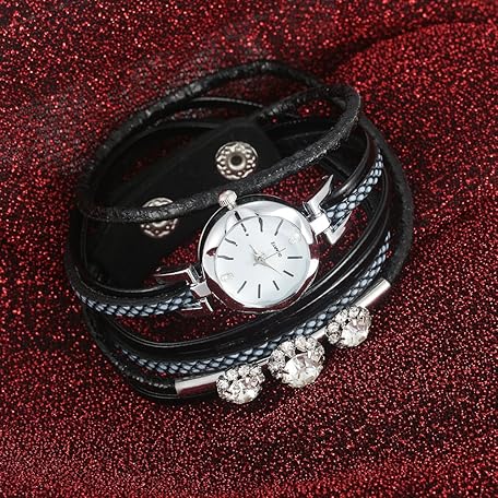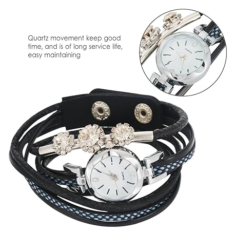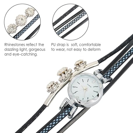 FILFEEL Women Watches Rhinestone PU Strap Round Dial Quartz Bracelet Wrist Watch Black, Black