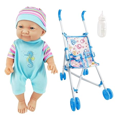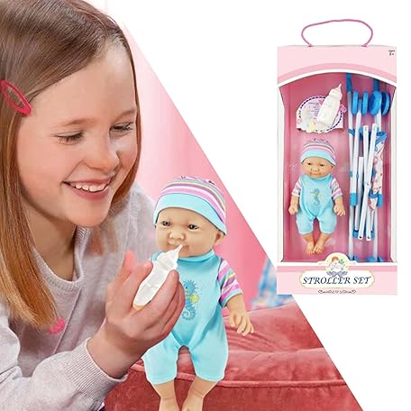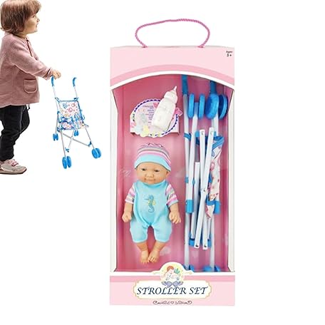 Folding Doll Stroller Set, Doll Stroller with Doll for Kids | Vista Print 10 Inch Nursery Doll Set Folding Doll Stroller, Doll Playset Pretend Play Stroller Toy Set with Bottle for Kids