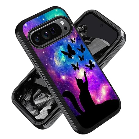 Google Pixel 9 Pro XL スマホケース ミリタリーグレード 高耐久 3層 耐衝撃 落下保護カバー Google Pixel 9 Pro XL (2024)、Galaxy Nebula Cat and Butterfly