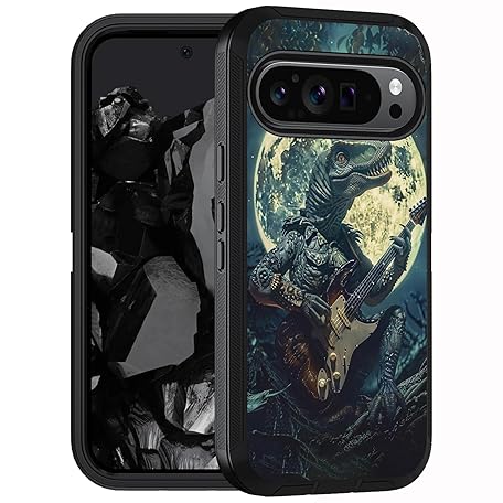 Google Pixel 9 Pro XL用ケース、ミリタリーグレードヘビーデューティー3層耐衝撃フルボディ保護カバー Google Pixel 9 Pro XL (2024)、恐竜 月の下でギターを弾く