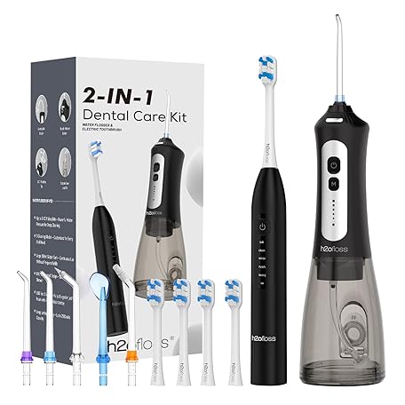 • H2ofloss 音波電動歯ブラシとウォーターフロッサーコンボ 充電式 2000mAh歯ブラシ 2500mAh 口腔洗浄器 300mlタンク付き ブラシヘッド4個 ノズル5個 2イン1 家庭や旅行用 (ブラック)