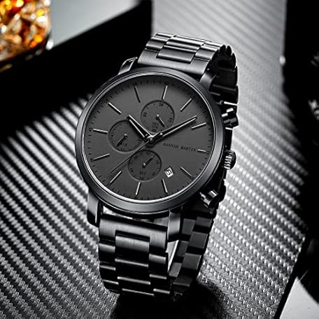 Thông tin sản phẩm HANNAH MARTIN Men's Watches Stainless Steel Waterproof Analog Quartz Business Chronograph Wrist Watch for Men, Black (Black), black black, Versatile