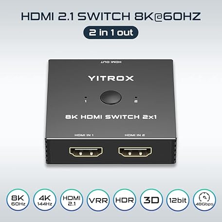 Thương hiệu YITROX là cái tên nổi tiếng được rất nhiều khách hàng trên thế giới chọn lựa. Với kiểu dáng đẹp mắt, sang trọng, sản phẩm HDMI 2.1 Switch 8K 60Hz 4K 120Hz HDMI Splitter Switch 2 in 1 Aluminum Shell for PS4/PS5 Xbox Fire Stick Apple TV Roku HD TV là sự lựa chọn hoàn hảo nếu bạn đang tìm mua một món cho riêng mình.
