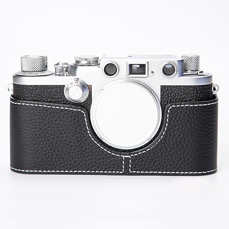 ヴィンテージ本革カメラケース、ライカIIIF用ハーフラップ本革カメラプロテクター(ブラック-ホワイトライン)