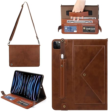ハンドバッグケース iPad Pro 11インチ (第2/第3世代) & iPad Air 10.9インチ (第4/第5世代) 用 二つ折りスタンド iPad 斜めがけ ウォレットケース ペンシルホルダー付き ハンドストラップ ショルダーストラップ保護カバー コーヒー