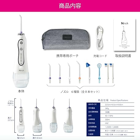 Thông tin sản phẩm 口腔洗浄器 ジェットウォッシャー ナノバブル フロッサー フロス オーラルケア 歯間ケア コードレス 白 日本製ナノバブル IPX7 防水 300ml Nrich エンリッチ ナノバブル水流 汚れ取れる 歯