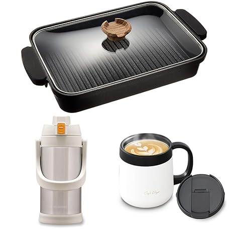 Iris Ohyama CD-2WT380 Frying Pan, Grill Pan, IH, Oven Safe, Wide Size, 8.1 gal (2.9 L), 14.7 x 8.8 x 2.4 inches (37.2 x 22.3 x 6 cm), SKL-G + Water Bottle, 2L Ivory, Sports Bottle, One-Touch Opening