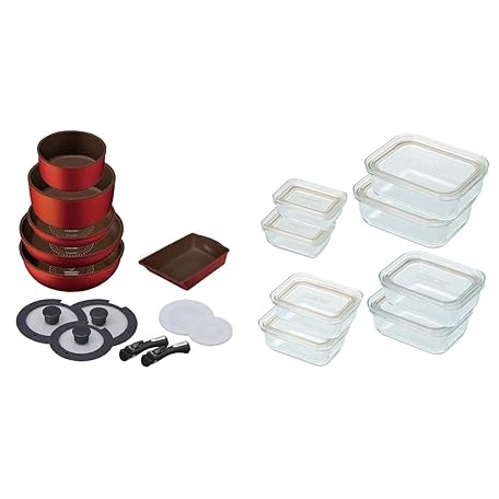 Iris Ohyama H-IS-SE13P 13-Piece Frying Pan and Pot Set, Orange & TGS-8S Heat-Resistant Glass Container, Clear