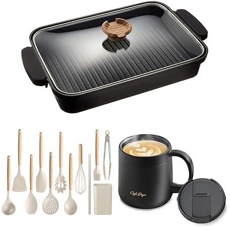 Iris Ohyama KT-11SS Frying Pan, Grill Pan, IH, Oven Compatible, Wide Size, 0.8 gal (2.9 L), 14.7 x 8.8 x 2.4 inches (37.2 x 22.3 x 6 cm), SKL-G + Whisk, Kitchen Tools with Tool Stand, 11 fl oz (37.2