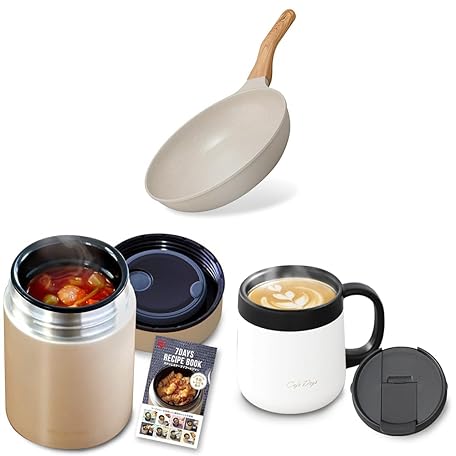 Iris Ohyama NTL-F26MO Frying Pan, 10.2 inches (26 cm), For Both Induction and Gas Fires, Natural Frying Pan, Graceful Mocha + Vacuum Insulated Soup Jar, 13.5 fl oz (400 ml), Gold, Keeps Hot Above 14.6