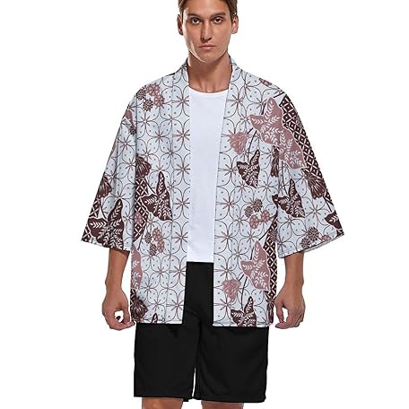 Janikin(ジャニキン) Japanese Cardigan, Retro, Batik Indonesia, Men's Cardigan, Shirt, Open Collar, T-Shirt, Top, Coat, Kimono, 3/4 Sleeves, Breathable, Loose, Cool, Open Front, No Buttons, Large Size, Stylish, M