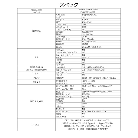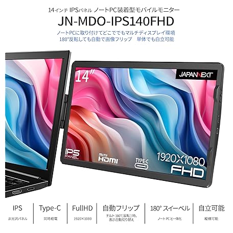 • JAPANNEXT 14インチ モバイルモニター IPS パネル フルHD 1920x1080解像度 (Type C/MAC PC対応 / sRGB100% / 非光沢) JN-MDO-IPS140FHD