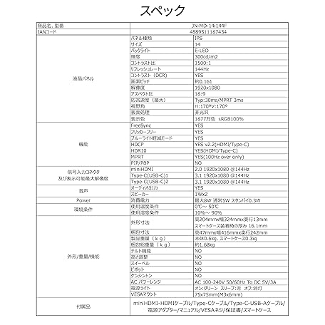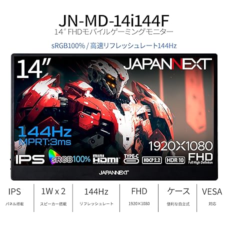 JAPANNEXT 14インチ モバイルモニター IPS パネル フルHD 1920x1080解像度 スマートケース付き (USB/Type C/MAC PC対応/スピーカー内蔵 / sRGB100% / 非光沢) JN-MD-14i144F
