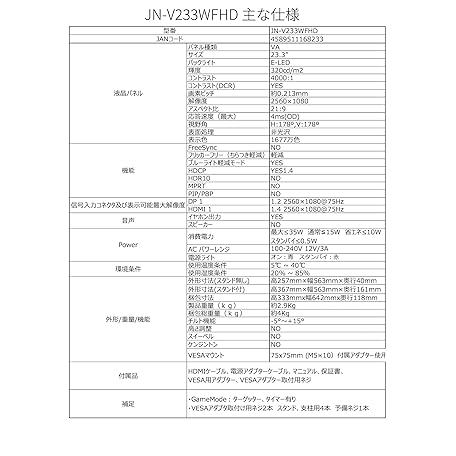• JAPANNEXT 23.3インチ モニター WFHD 2560x1080解像度 VA ディスプレイ (HDMI/DisplayPort/VESA対応/ブルーライトカット) JN-V233WFHD