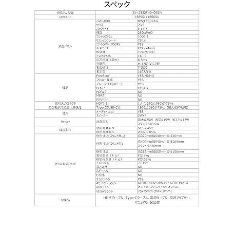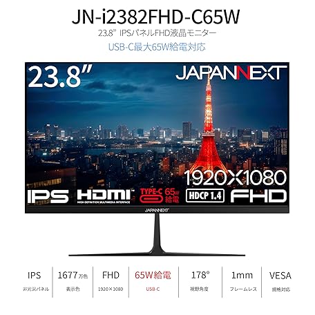 JAPANNEXT 23.8インチ モニター フルHD 1920x1080解像度 IPS ディスプレイ (HDMI/USB-C 給電 (65W) / スピーカー内蔵/VESA対応/ブルーライトカット) JN-i2382FHD-C65W