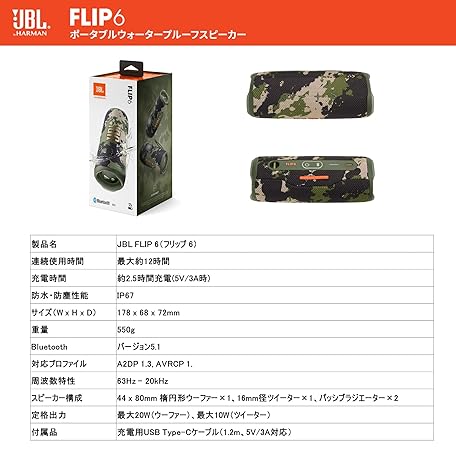 Sản phẩm JBL FLIP6 Bluetooth Speaker, 2-way, Speaker Configuration/ USB-C Charging / IP67 Dustproof Waterproof / Equipped with Passive Radiator / Portable, Squad JBLFLIP6SQUAD đang được bán với giá ưu đãi là $86.219 tại nước Nhật.