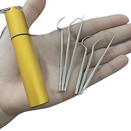 • [Kawoly]ステンレス製デンタルピックセット 【歯間ケア3点セット】携帯用コンパクト設計 歯間汚れ除去ツールでいつも清潔 304ステンレス製リユーザブル 旅行外出先のお手入れに 黄色 つまようじ6本