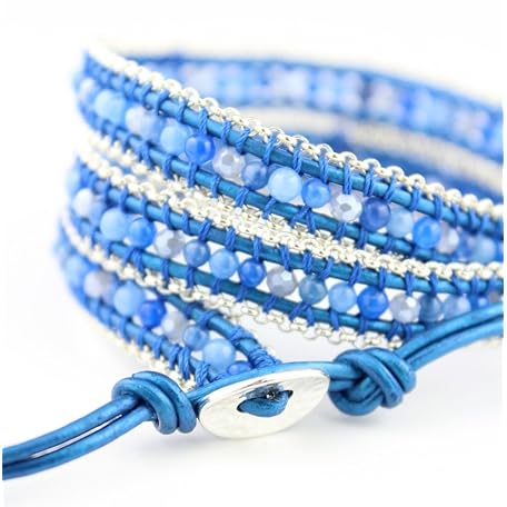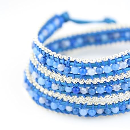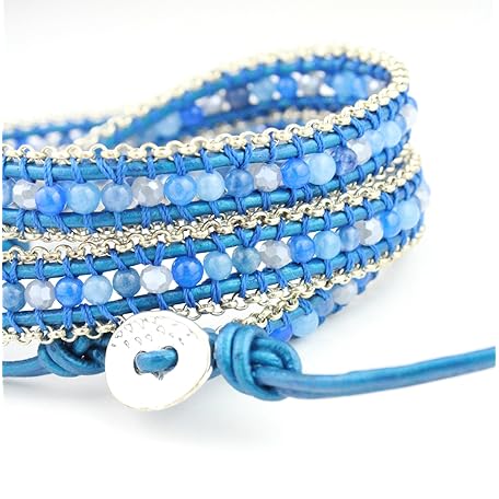 [ケイウンドウ]KEIUNDOオリジナル レザー 3連 ラップ ブレスレット 天然石 アヴェンチュリン アジアン ブルーチェーン 本革 巾着袋付き メンズ レディース keiabc03