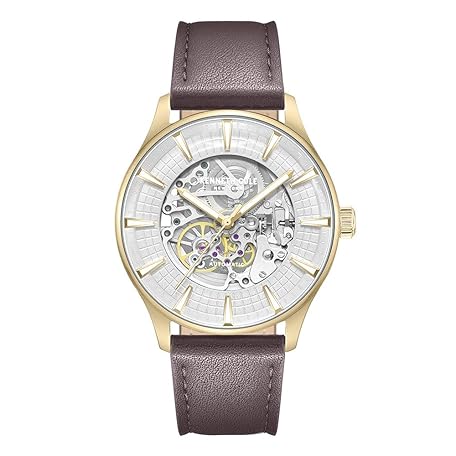 Kenneth Cole New York Luxury Men's Automatic Movement Waterproof Watch with Sophisticated Refined Design, gold-dark brown leather strap