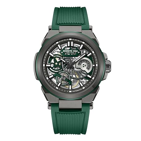 • Kenneth Cole New York メンズ自動巻き腕時計 – 自動巻きムーブメント、スケルトンダイヤル、ステンレススチールケース、クラシックなドレススタイル、カジュアルファッション時計、日常着や万能な服装に。, グリーン - シリコン。, Mens Standard, 自動。