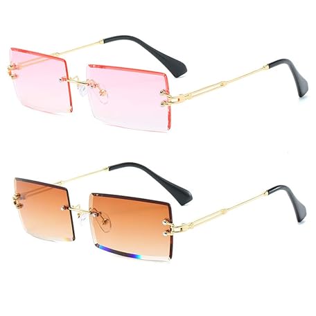 • LASPOR レトロ縁なし長方形サングラス レディース メンズ ティントレンズ ゴールドメタル フレームレス ヴィンテージ スクエアグラス, ピンク + ブラウン。