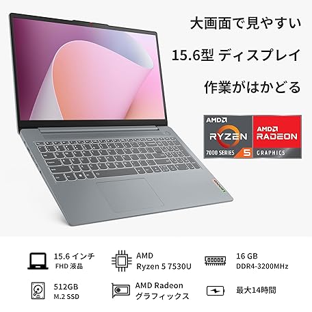• Lenovo IdeaPad Slim 3 Gen 8 82XM00FCJP Laptop [Arctic Gray] (Ryzen 5 7530U, 16GB Memory, 512GB SSD, 15.6 Full HD)