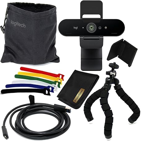 Logitech Brio Ultra 4K HD Pro Webcam for PC & Laptop Video Meeting & Gaming with Noise Cancelling Mic Camera Lens Cover Pouch + PremGear Flexible Tripod Cord Organizer Tie & Cloth