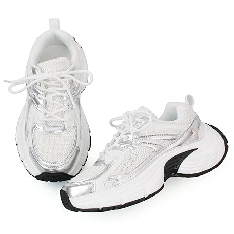 Loomnine Women's Korea Mesh Upper, Lightweight, Volume Sole, High-tech, Low-cut, Dad, Sneakers, Clean, Simple, Black, White, Lace-up, Korea, Silver, 22.5 to 23 cm