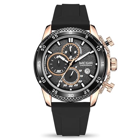 MEGIR メンズ スポーツ アナログ クロノグラフ 夜光クォーツウォッチ スタイリッシュなシリコンストラップ付き ギフト用 ブラック クロノグラフ クォーツウォッチ, ブラック///ホワイト, クロノグラフ、クォーツ腕時計。